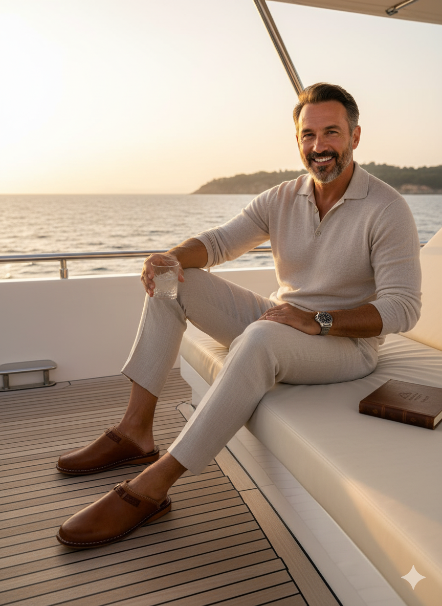 Experience genuine Moroccan heritage. These butter-soft leather babouche mules are entirely handmade by skilled artisans. Featuring a comfortable slip-on back and subtle decorative stitching, they are the perfect blend of traditional craft and modern elegance. Ideal for indoor comfort or light outdoor style.