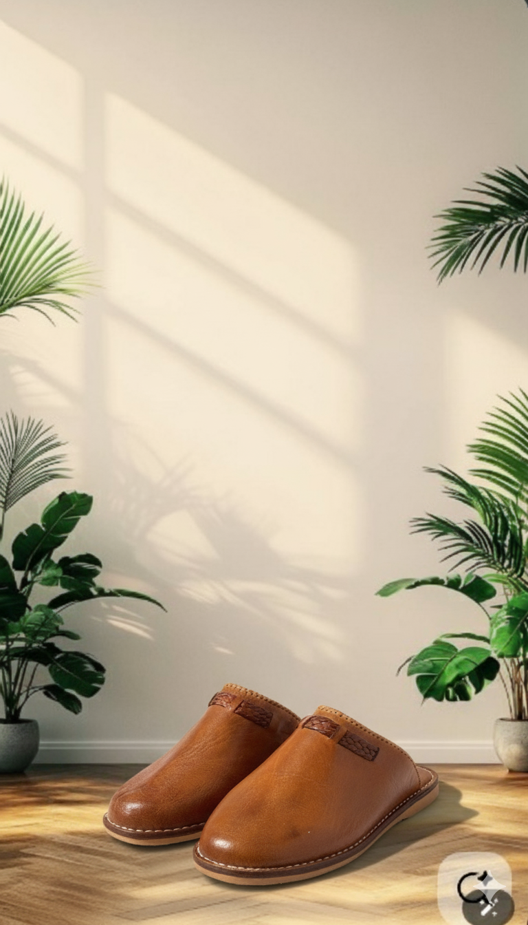 These brown leather mules are a contemporary take on a timeless classic. The artisan process begins in the historic tanneries of Marrakech or Fez, where natural dyes are used to achieve this deep, warm leather tone. The closed, slightly rounded toe offers a modern silhouette, while the slip-on, backless style guarantees ease of wear.