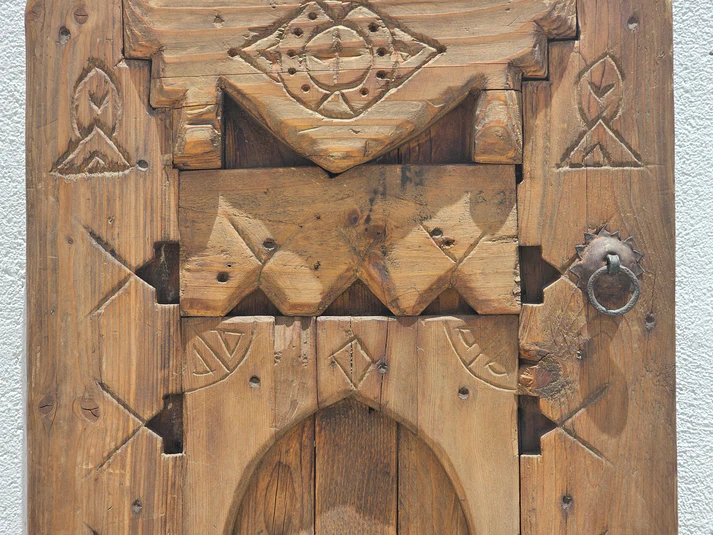 Handcrafted Amazigh wooden panel made from reclaimed solid wood, featuring authentic Berber motifs. Each unique piece brings warmth, heritage, and timeless Moroccan soul to any space.