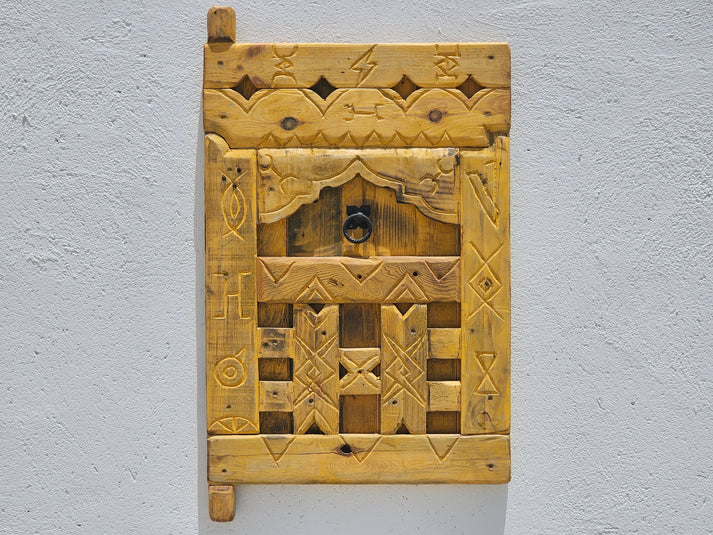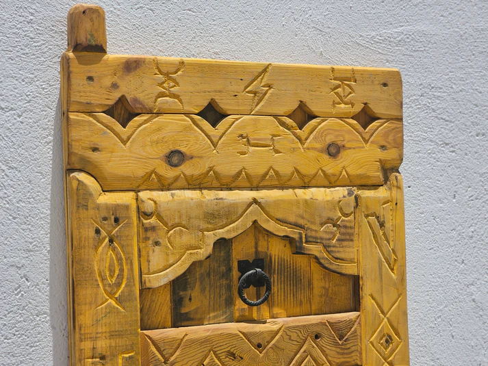 Handcrafted Amazigh wooden panel made from reclaimed solid wood, featuring authentic Berber motifs. Each unique piece brings warmth, heritage, and timeless Moroccan soul to any space.