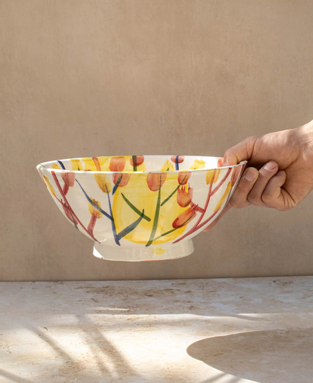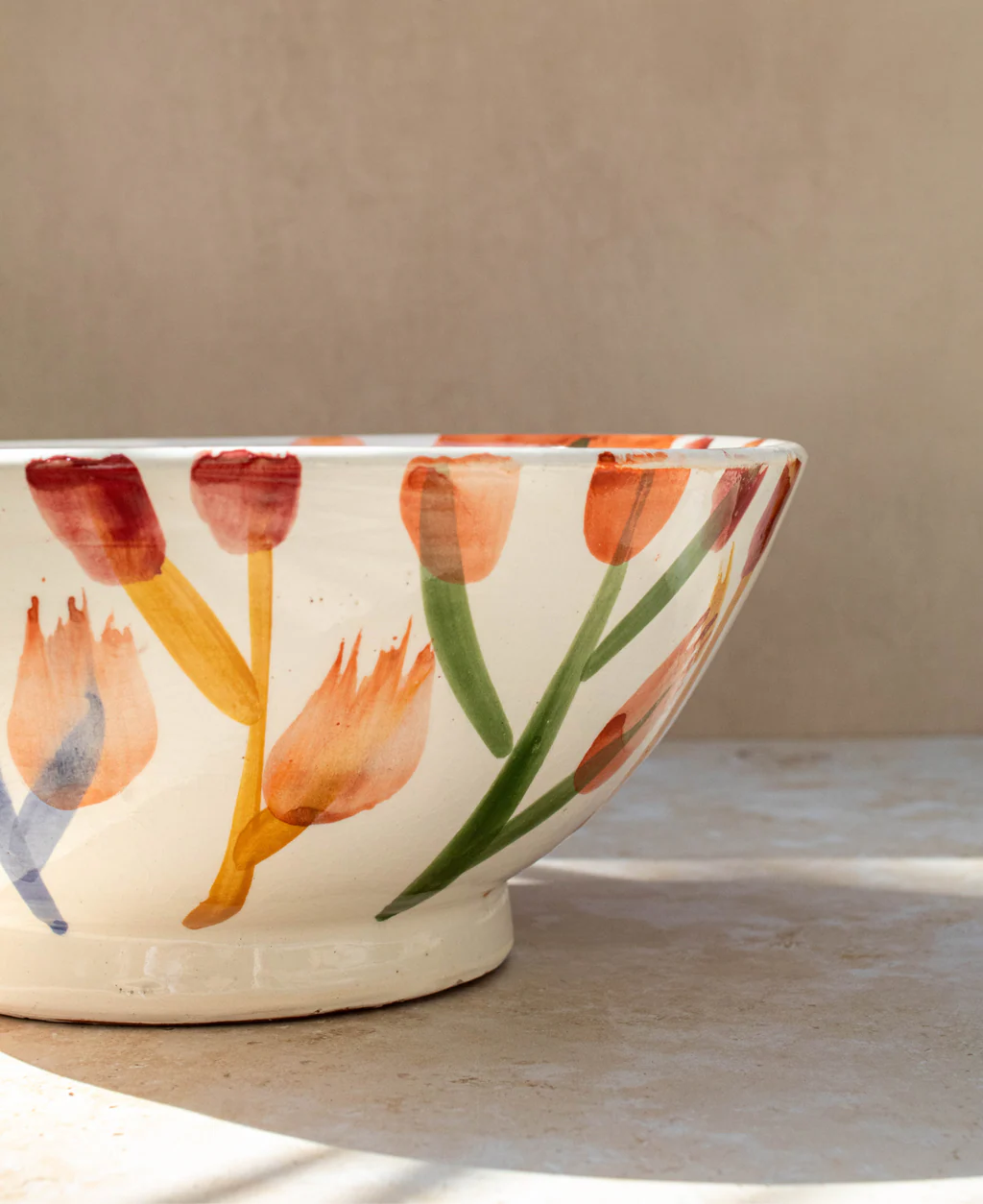 Ourika Spring Floral Bowl (25cm): A large, hand-painted Moroccan bowl featuring cheerful spring flower designs. Handmade near Marrakech with an improved, deeper form for salads and fruit. Brings artisan beauty and colour to your home, supporting local families.