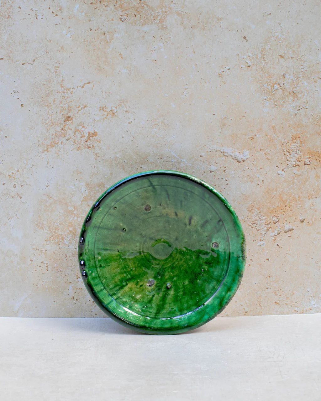 Elevate your table with this authentic Moroccan plate, handcrafted in Tamegroute. Each piece features the region’s signature, rich green glaze, achieved through a unique wood-firing process in underground kilns. This ancient technique ensures a distinct, one-of-a-kind finish with beautiful tonal variation, confirming its true artisanal origin.