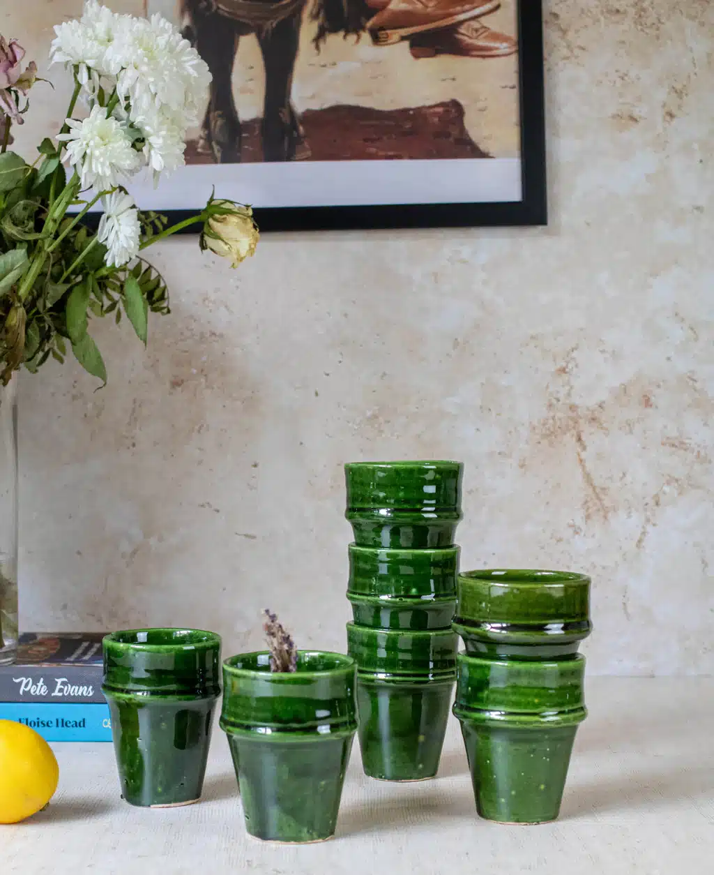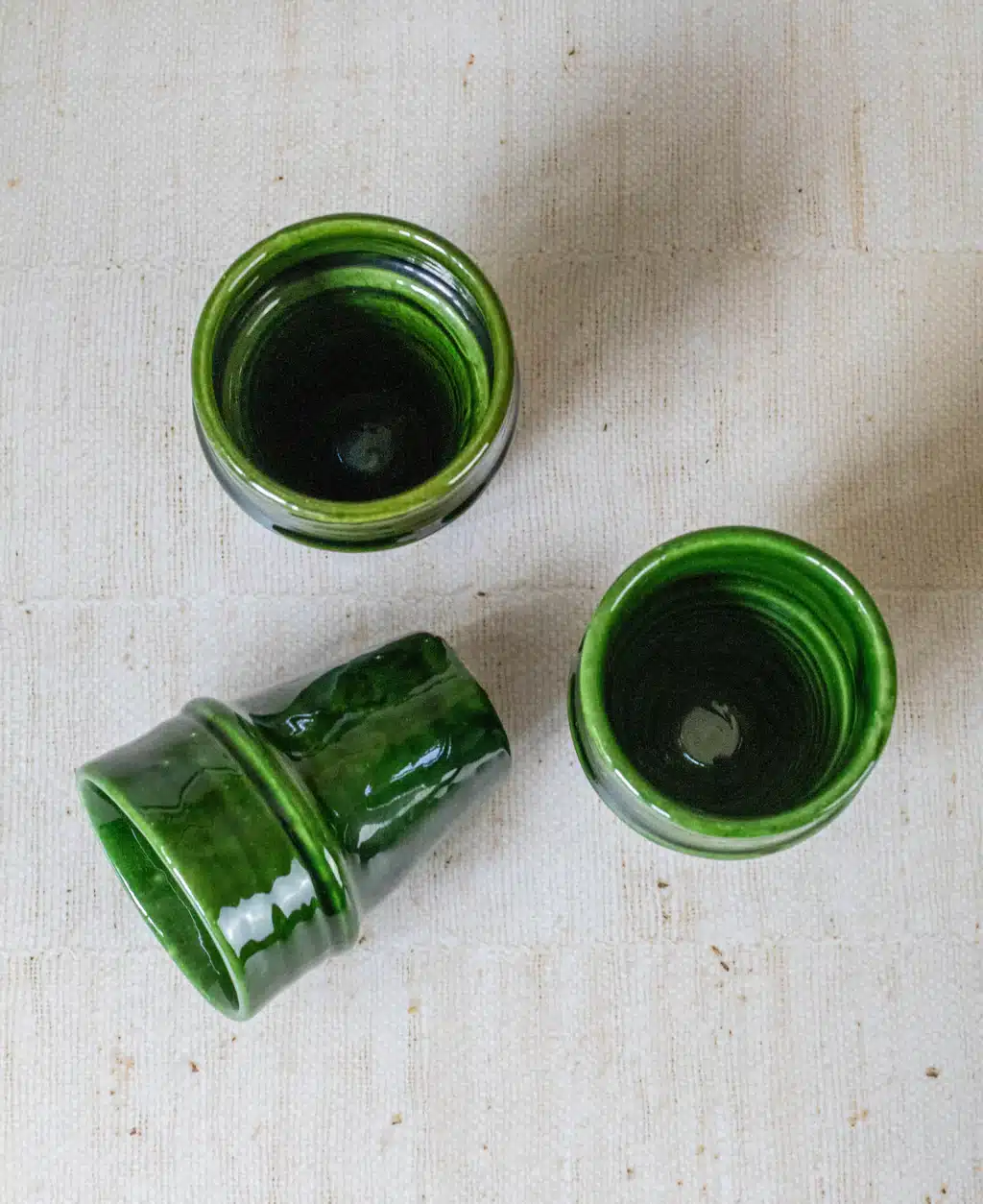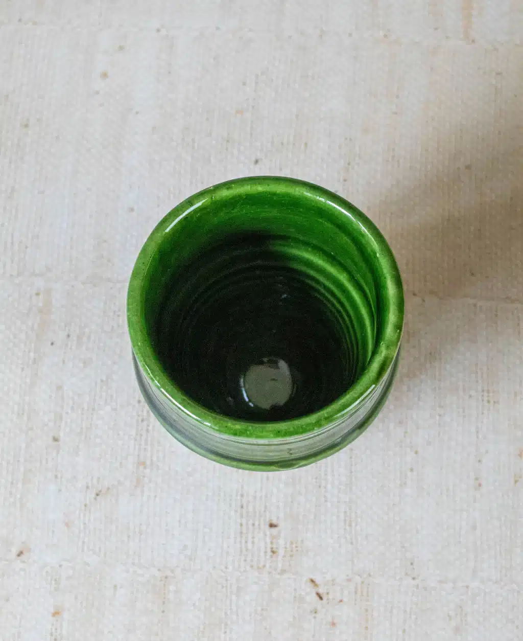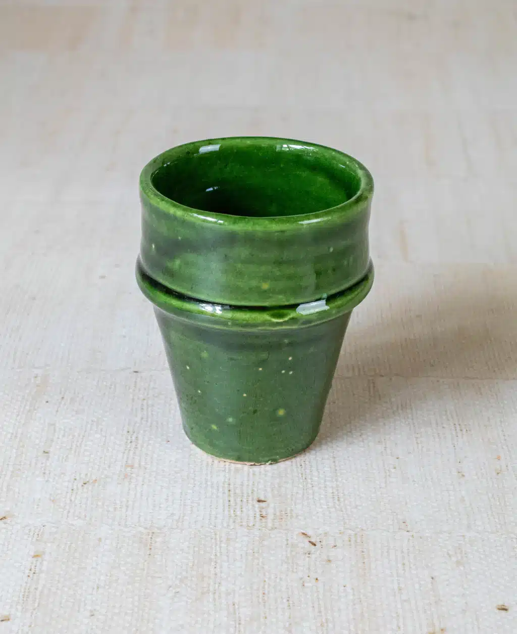 Tazekka Ceramic Tumbler: Handcrafted in Morocco, this tumbler features a rich green glaze beautifully contrasted with an exposed natural clay base. Perfect for serving water or juice. A rustic yet refined addition that supports local Moroccan families.