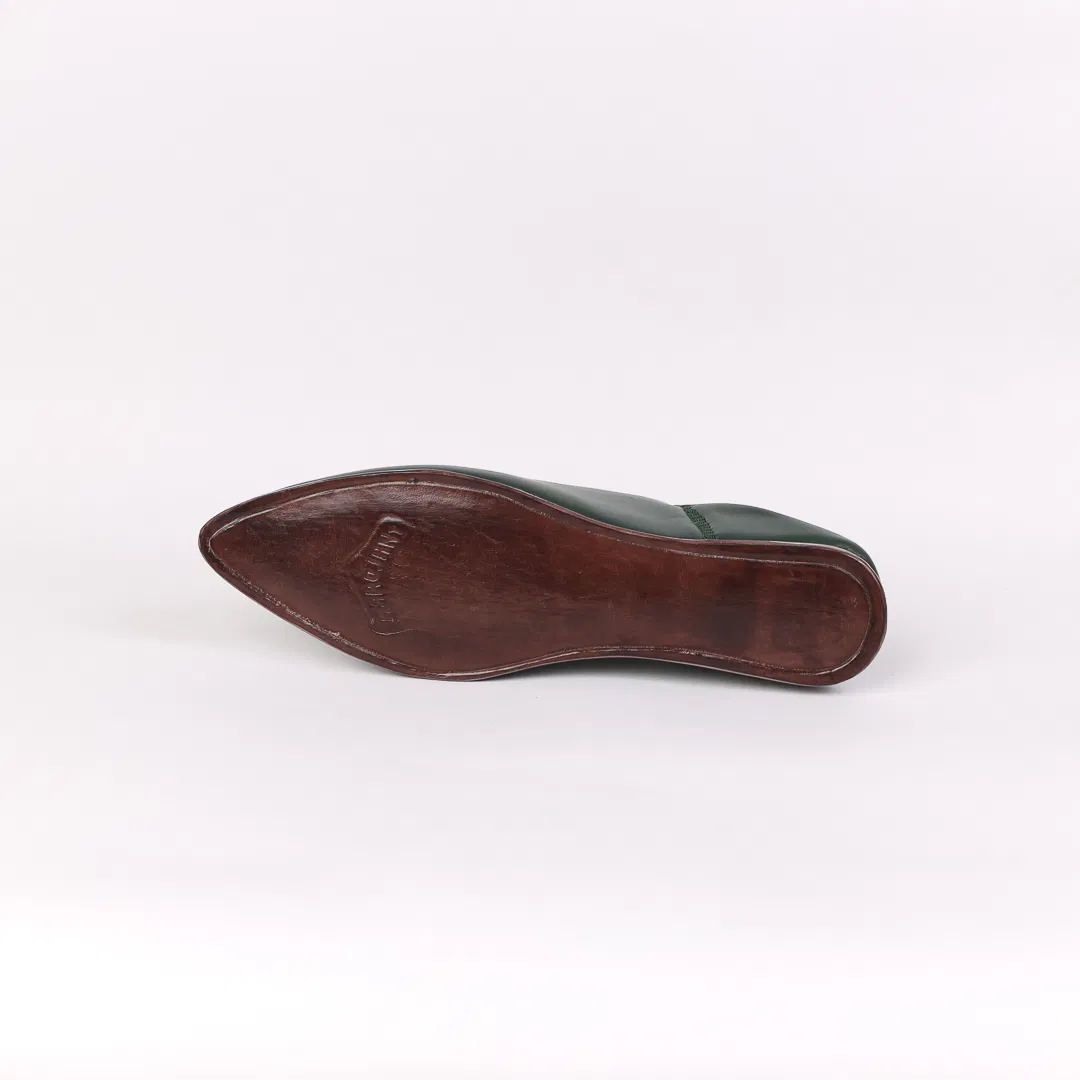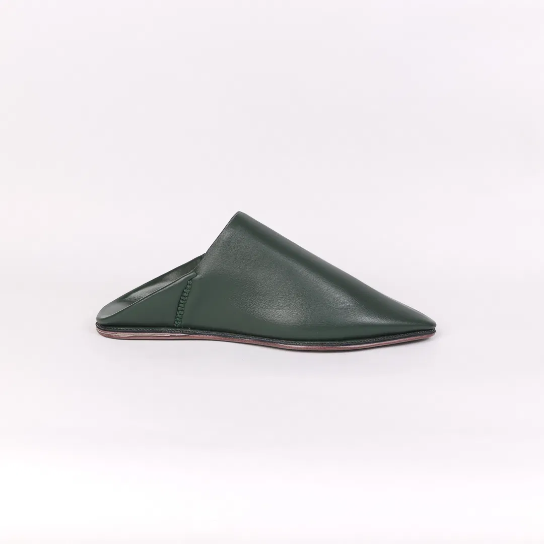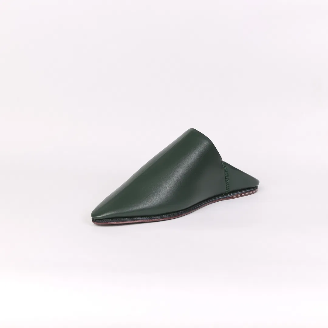 Handcrafted in Morocco from premium dark Green leather, this pointed-toe babouche blends tradition with minimalist elegance. A timeless slip-on for refined comfort and artisan style