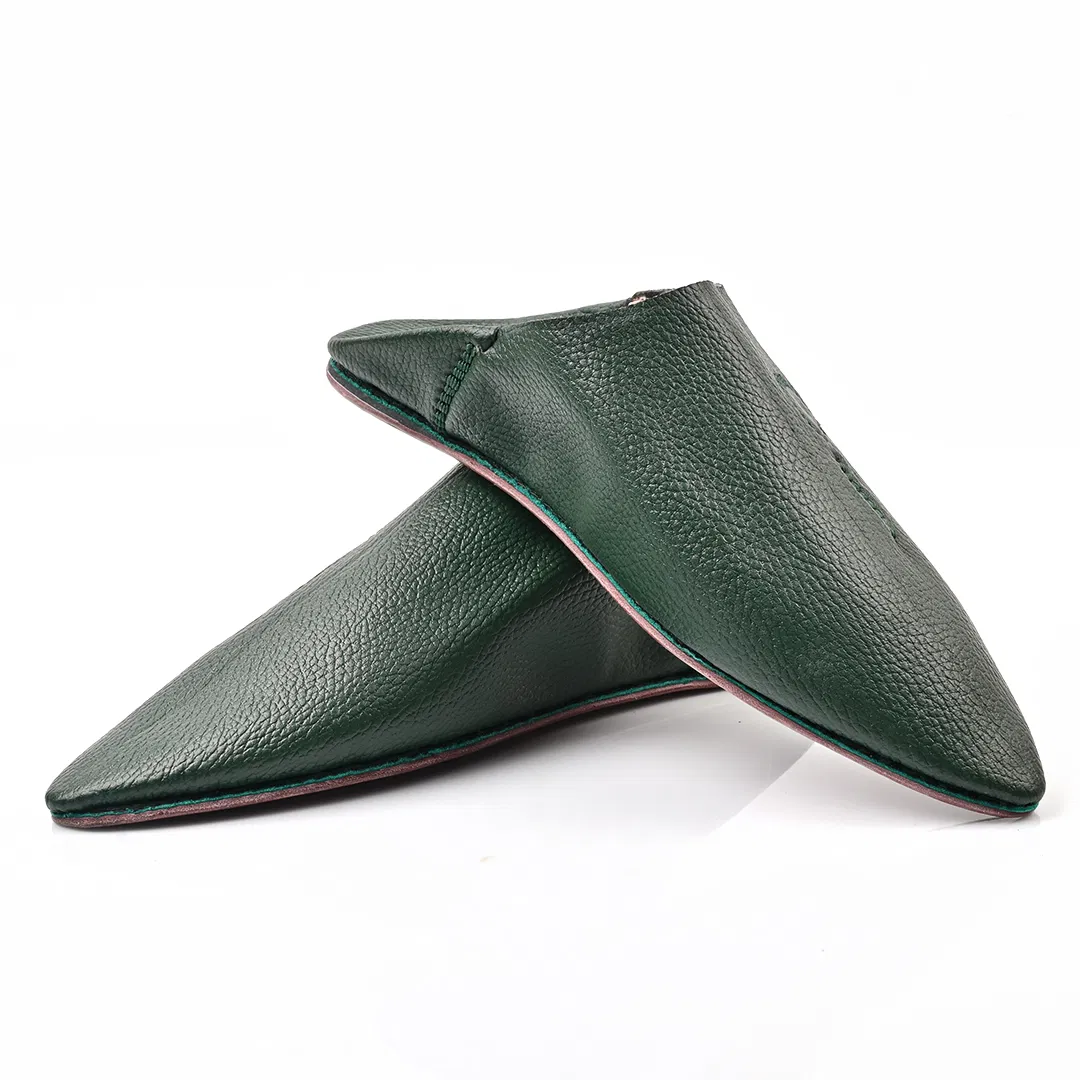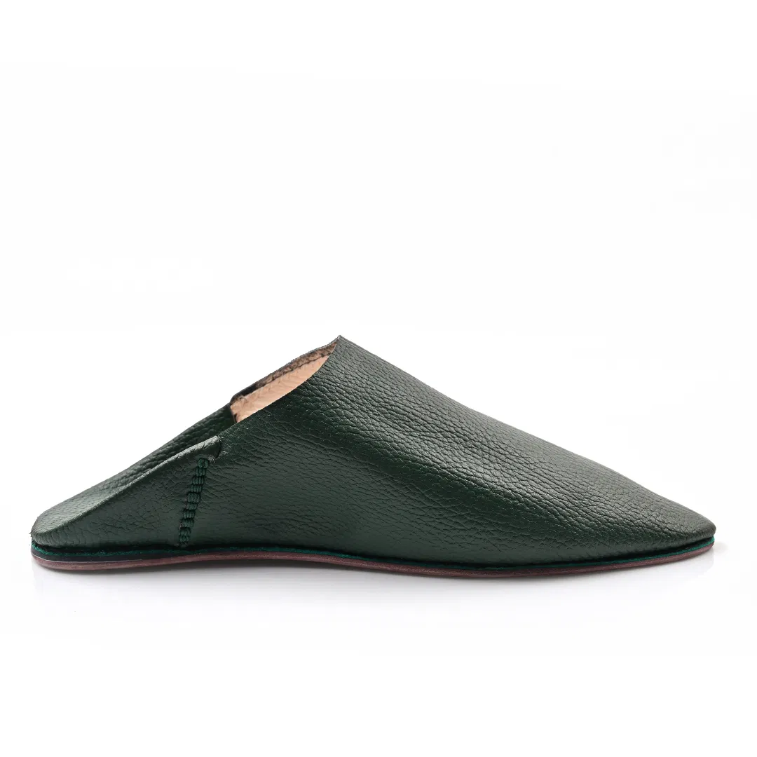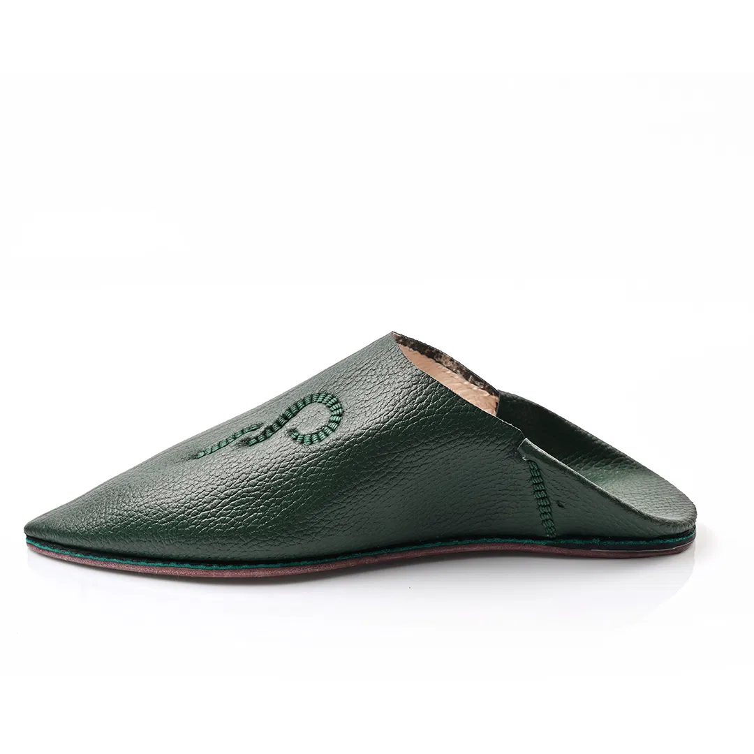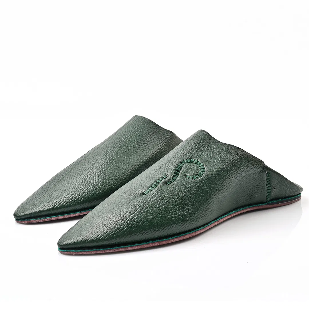 Step into timeless elegance with this Babooch slipper, crafted from rich Green leather that speaks of heritage and refinement. The pointed toe silhouette pays homage to traditional Moroccan design, while the minimalist structure offers effortless sophistication. Each pair is handmade using premium full-grain leather, showcasing a natural texture that enhances its artisanal character.