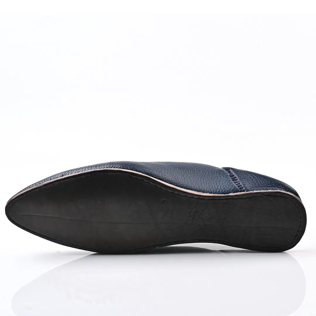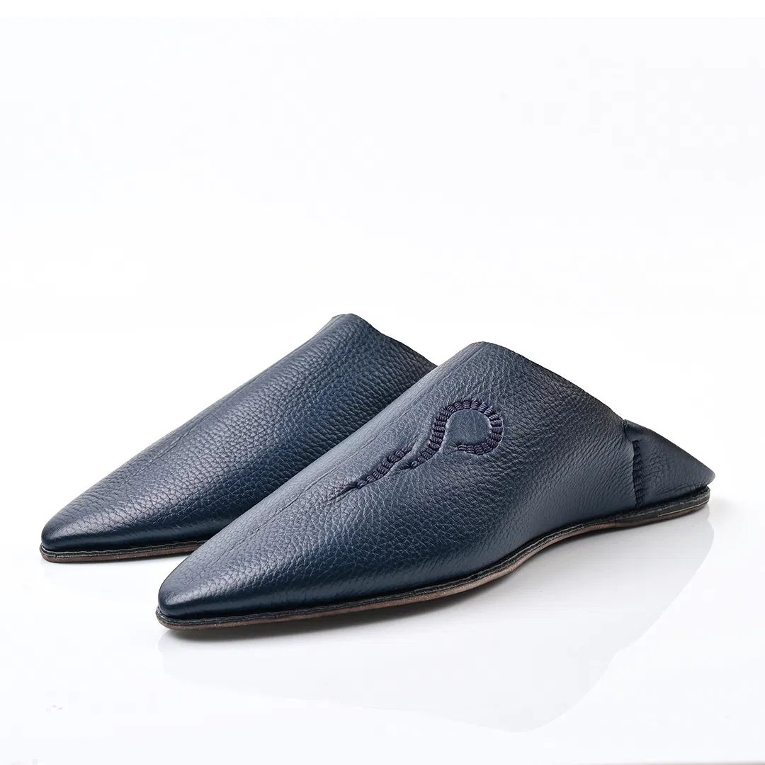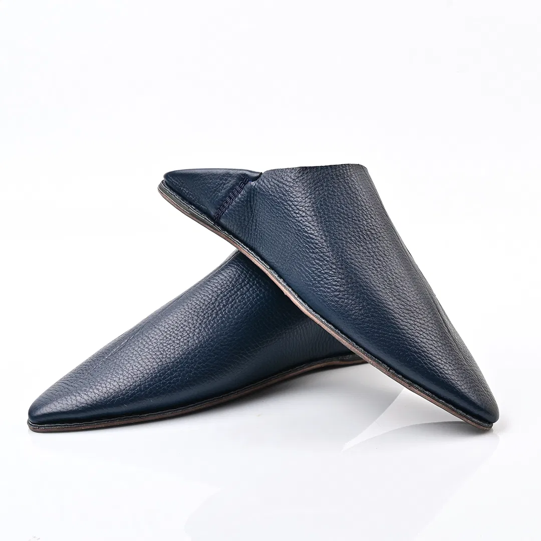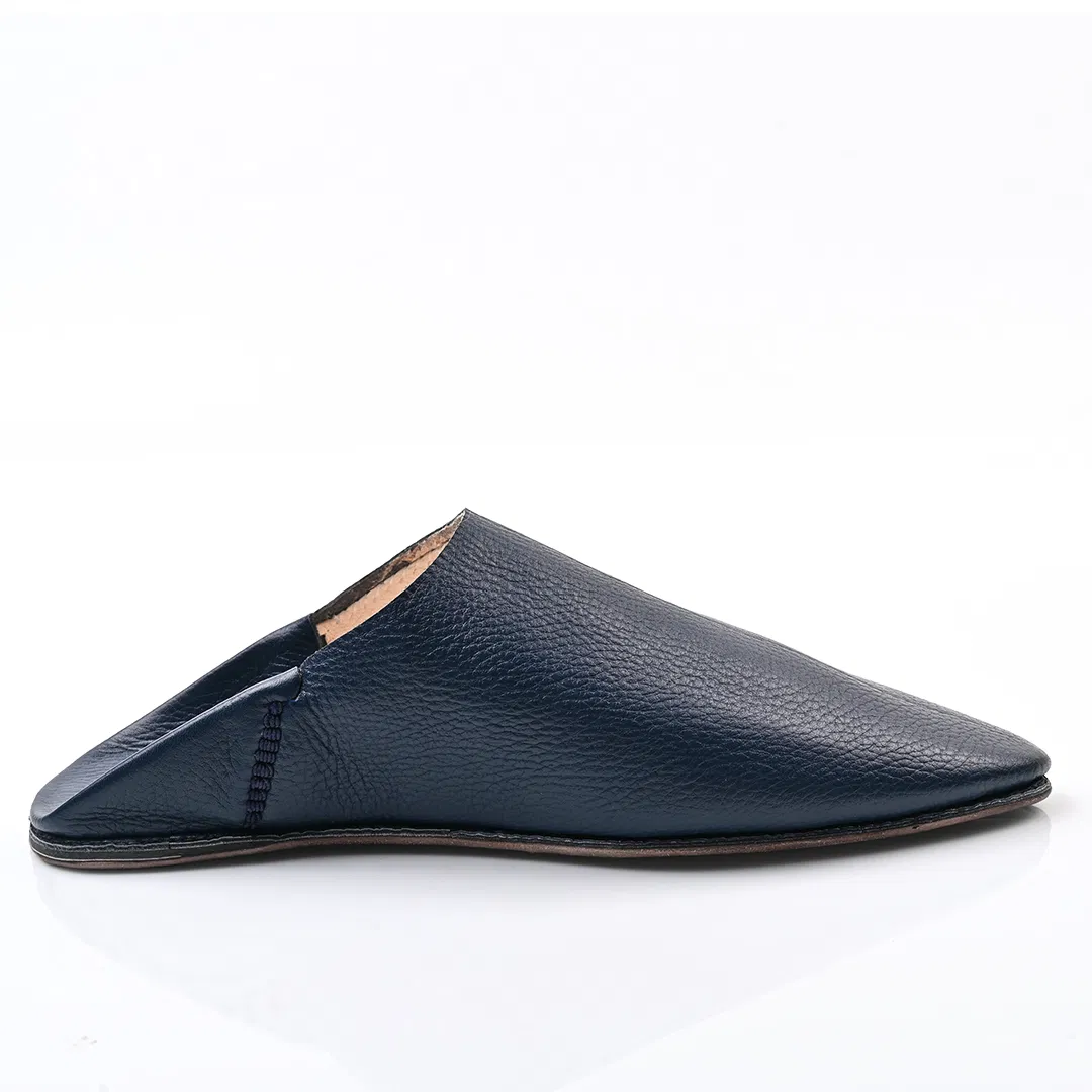 Handcrafted in Morocco from premium navy Bleu leather, this pointed-toe babouche blends tradition with minimalist elegance. A timeless slip-on for refined comfort and artisan style