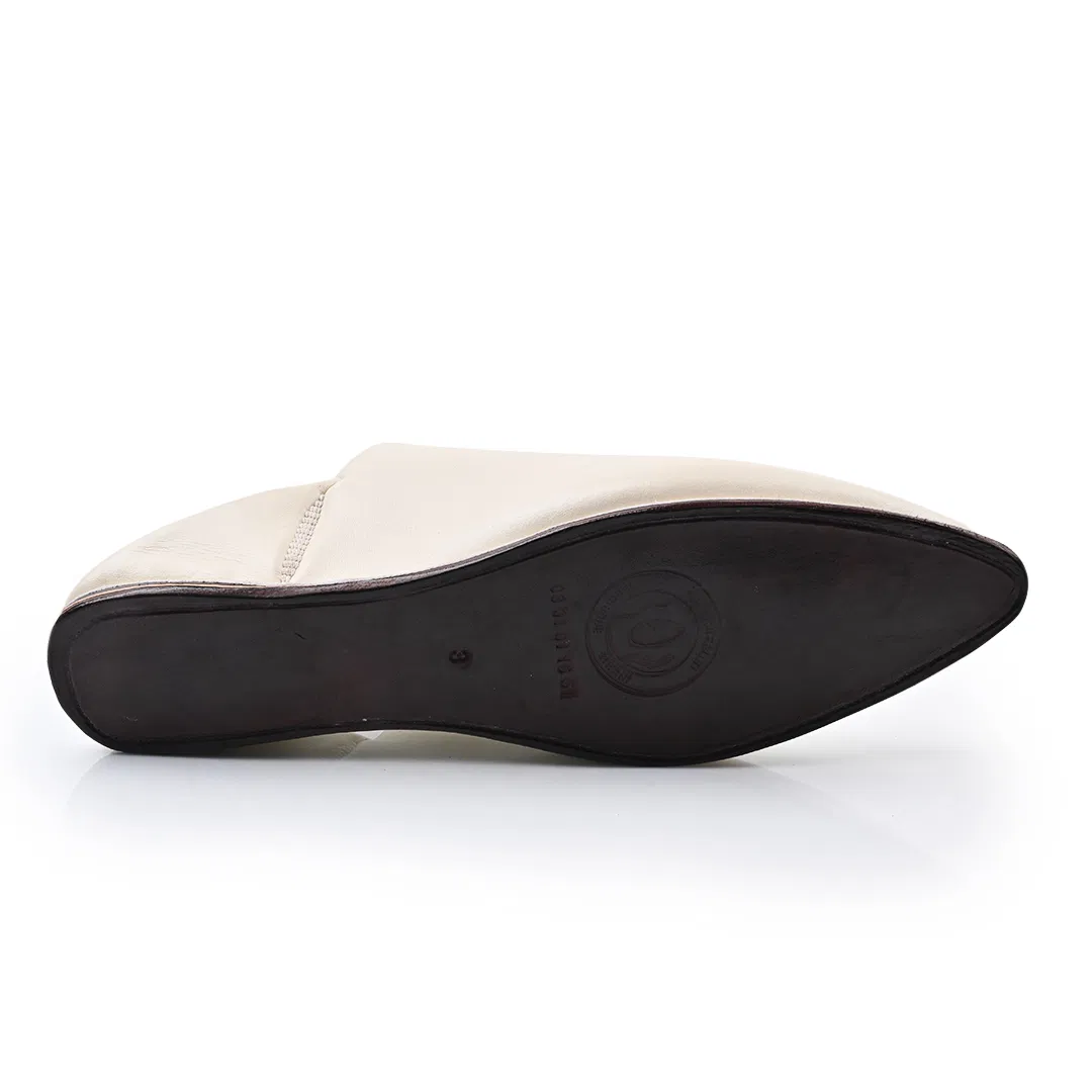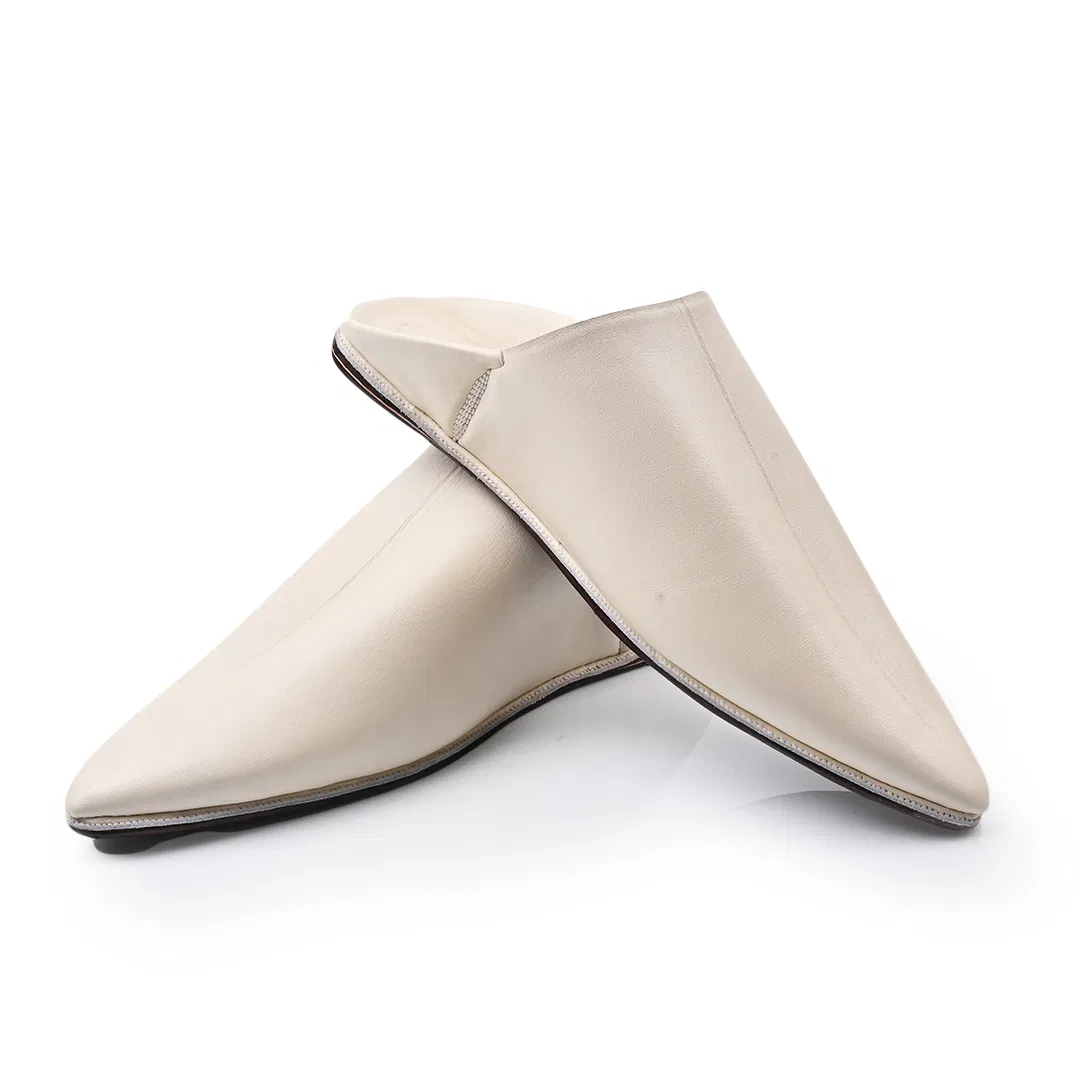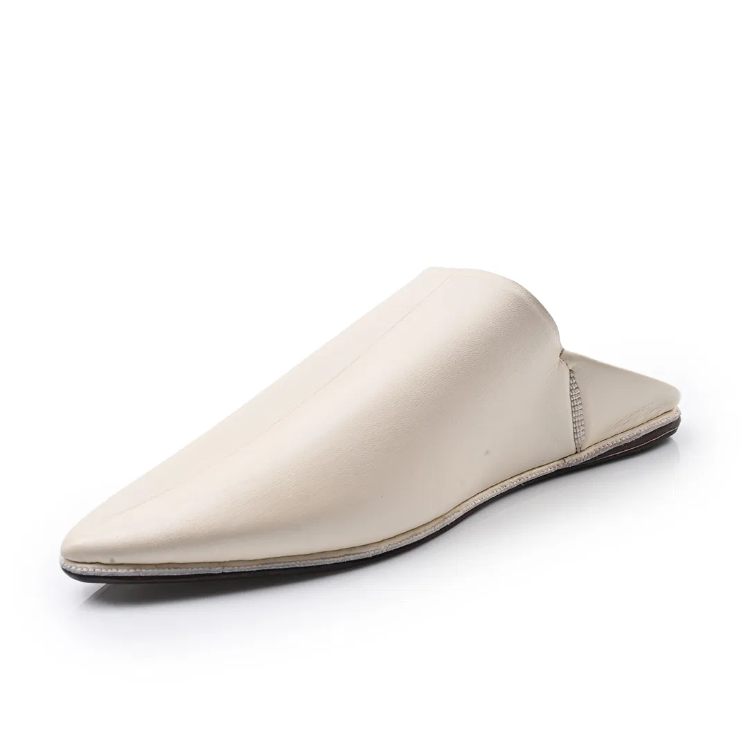 Handcrafted in Morocco from premium off-white leather, this pointed-toe babouche blends tradition with minimalist elegance. A timeless slip-on for refined comfort and artisan style